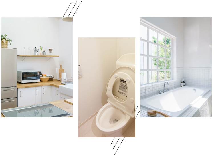 バス、トイレ、キッチン等傷みやすい、水廻りのリフォームやクロス、床、まで様々鳴りフォームに対応致します。各種メーカー取り扱っており、最安値でご案内致します。